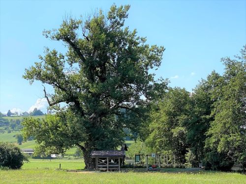 Der Ausblick von der Aussichtswarte ist geprägt von zahlreichen extensiv bewirtschafteten Wiesen, den vielen naturnahen Hecken und den alten, großen Streuobstbeständen und soll zur Erkundung aller 12 ERLebensräume in Unterlamm inspirieren.